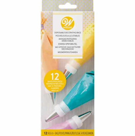 Praktiske engangssprøjteposer fra Wilton – perfekte til glasur, smørcreme, chokolade eller fyld til macarons. Poserne er stærke, fleksible og nemme at bruge, så du får fuld kontrol, når du dekorerer kager, cupcakes og småkager. Der er 12 stk i en pakke og de måler 40,6 cm i længden.